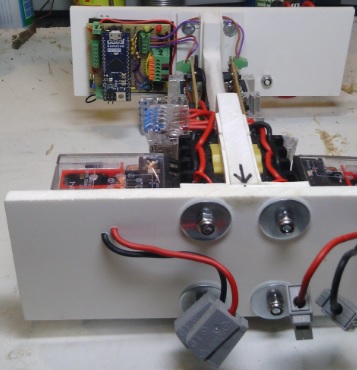 An Arduino "micro" reads incoming radio control pulses using hardware interrupts and generates PWM signals to drive the motors